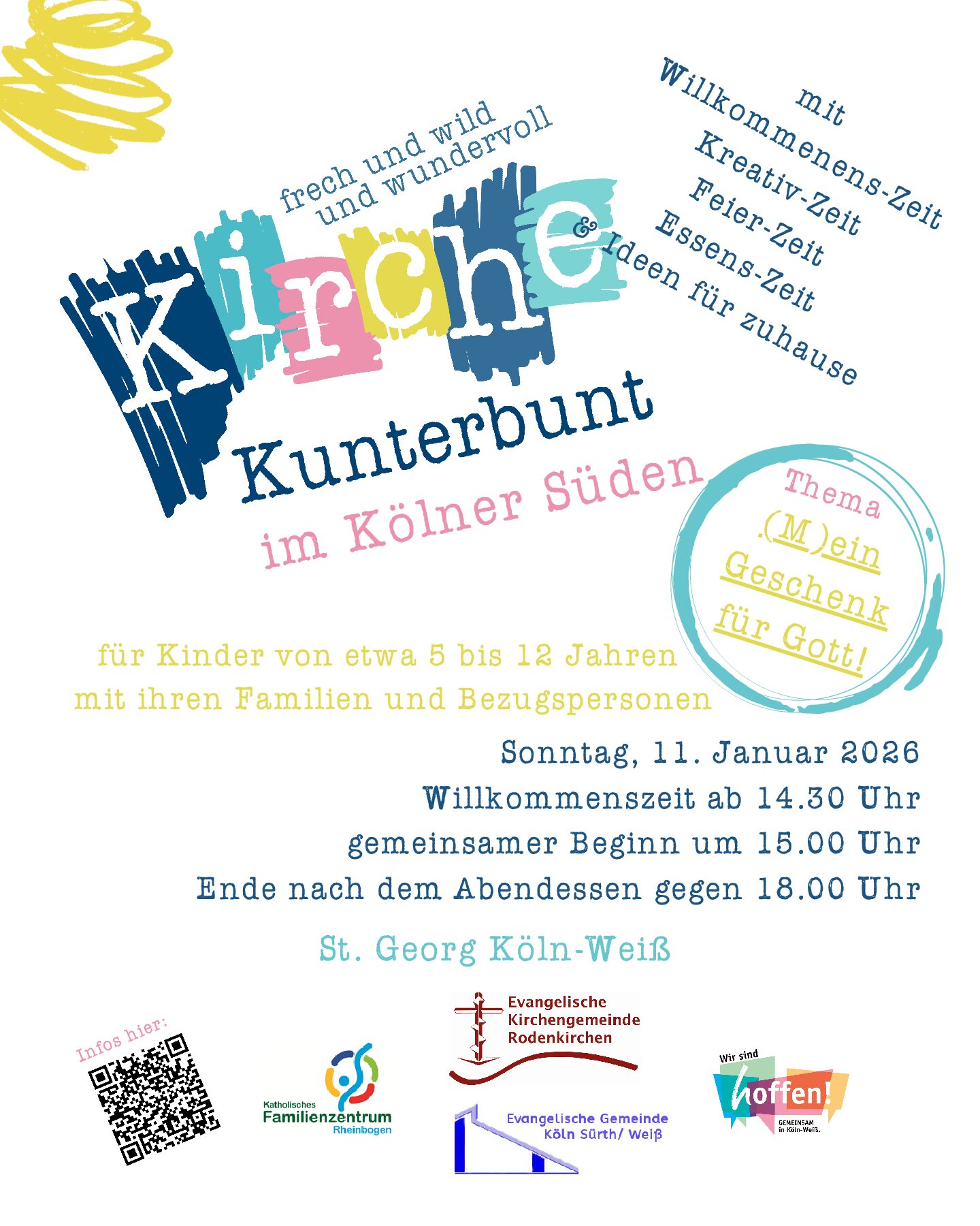 Am Sonntag, den 11.1.2026, findet ab 14.30 Uhr unsere nächste KircheKunterbunt in St. Georg in Weiß statt. Hierzu möchten wir alle Kinder von etwa 5 bis 12 Jahren mit ihren Familien und Bezugspersonen ganz herzlich