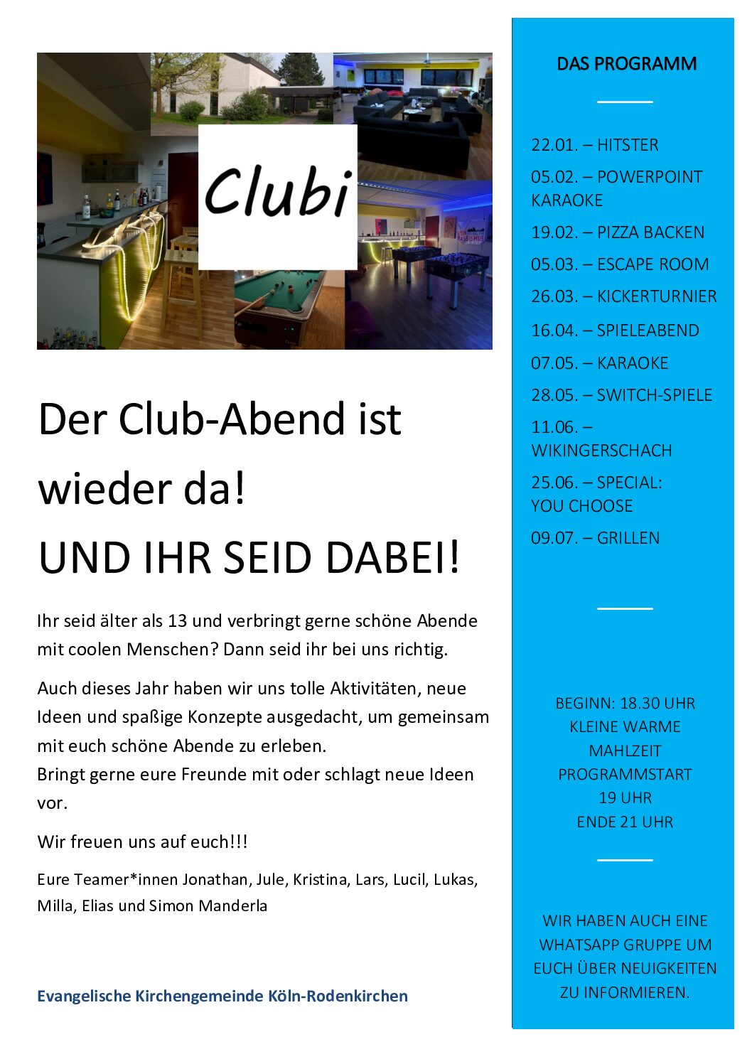 Ihr seid älter als 13 und verbringt gerne schöne Abende mit coolen Menschen? Dann seid Ihr bei uns genau richtig. Bringt gerne auch Eure Freunde mit zu unseren Club-Abenden! Wir freuen uns auf Euch! Euer