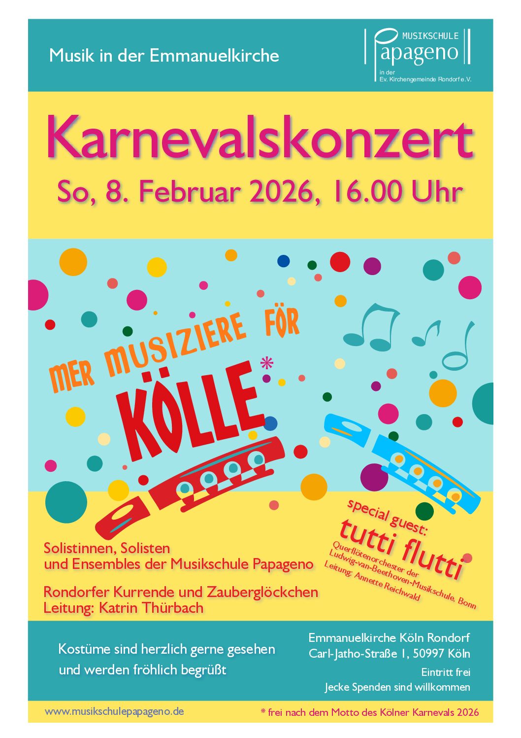 Am Sonntag, dem 8.2.2026, findet um 16.00 Uhr in der Emmanuelkirche das Karnevalskonzert der Musikschule Papageno statt. Es treten Solisten und Ensembles auf; unsere Kinder- und Jugendchöre, die „Zauberglöckchen“ und die „Kurrende“ bringen alte und