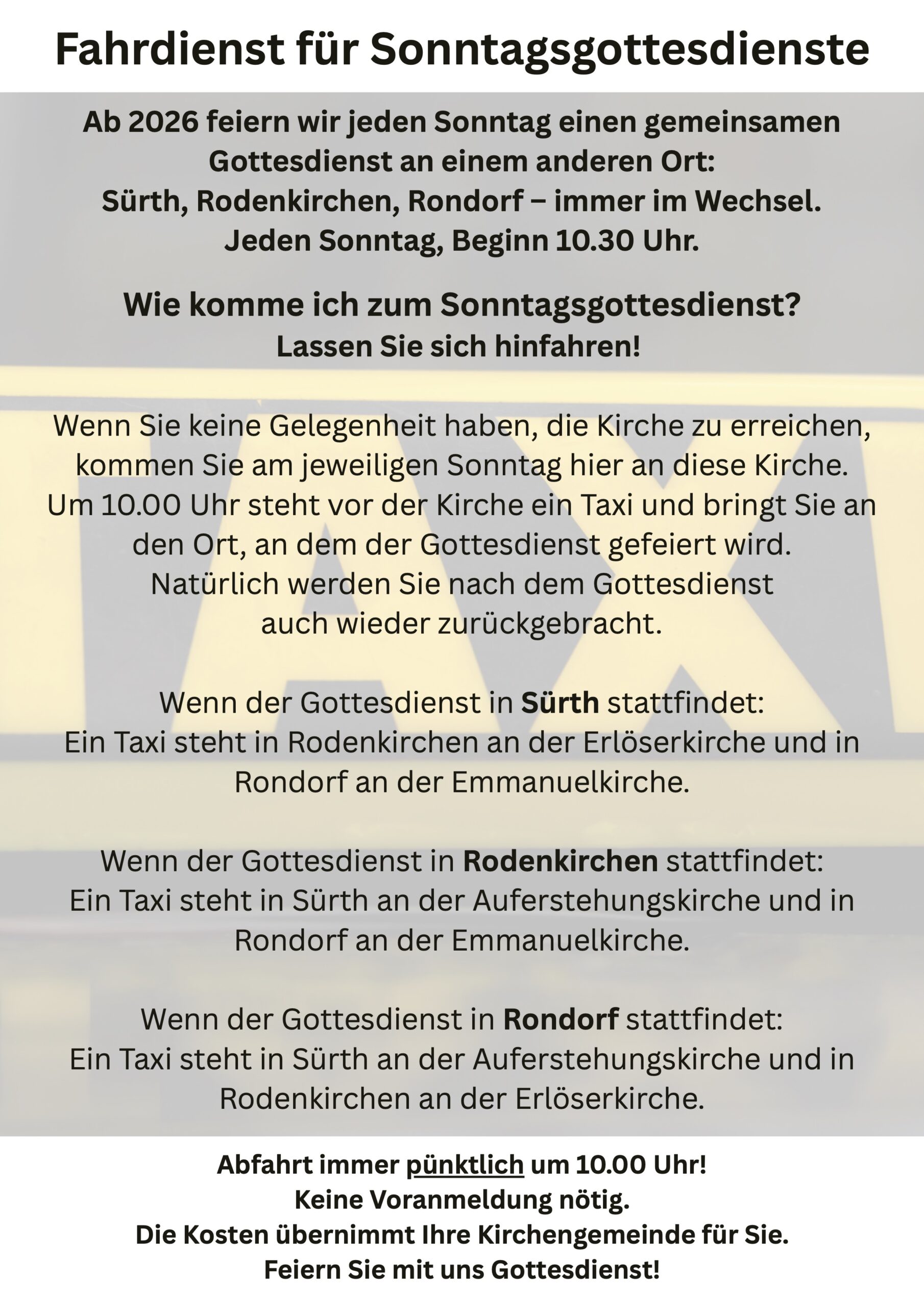 Ab 1. Januar finden Gottesdienste abwechselnd in einer unserer Kirchen statt. Wie Sie hinkommen, wenn Sie nicht so mobil sind? Die Antwort finden Sie hier!
