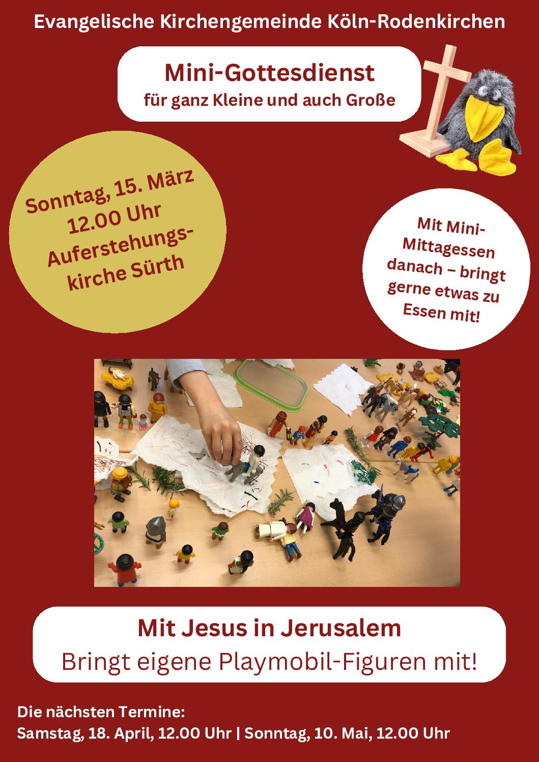 Herzliche Einladung zum Mini-Gottesdienst für ganz Kleine und auch Große am Sonntag, den 15.3.2026, um 12.00 Uhr in der Auferstehungskirche in Sürth! Wir freuen uns auf Euch/Sie!