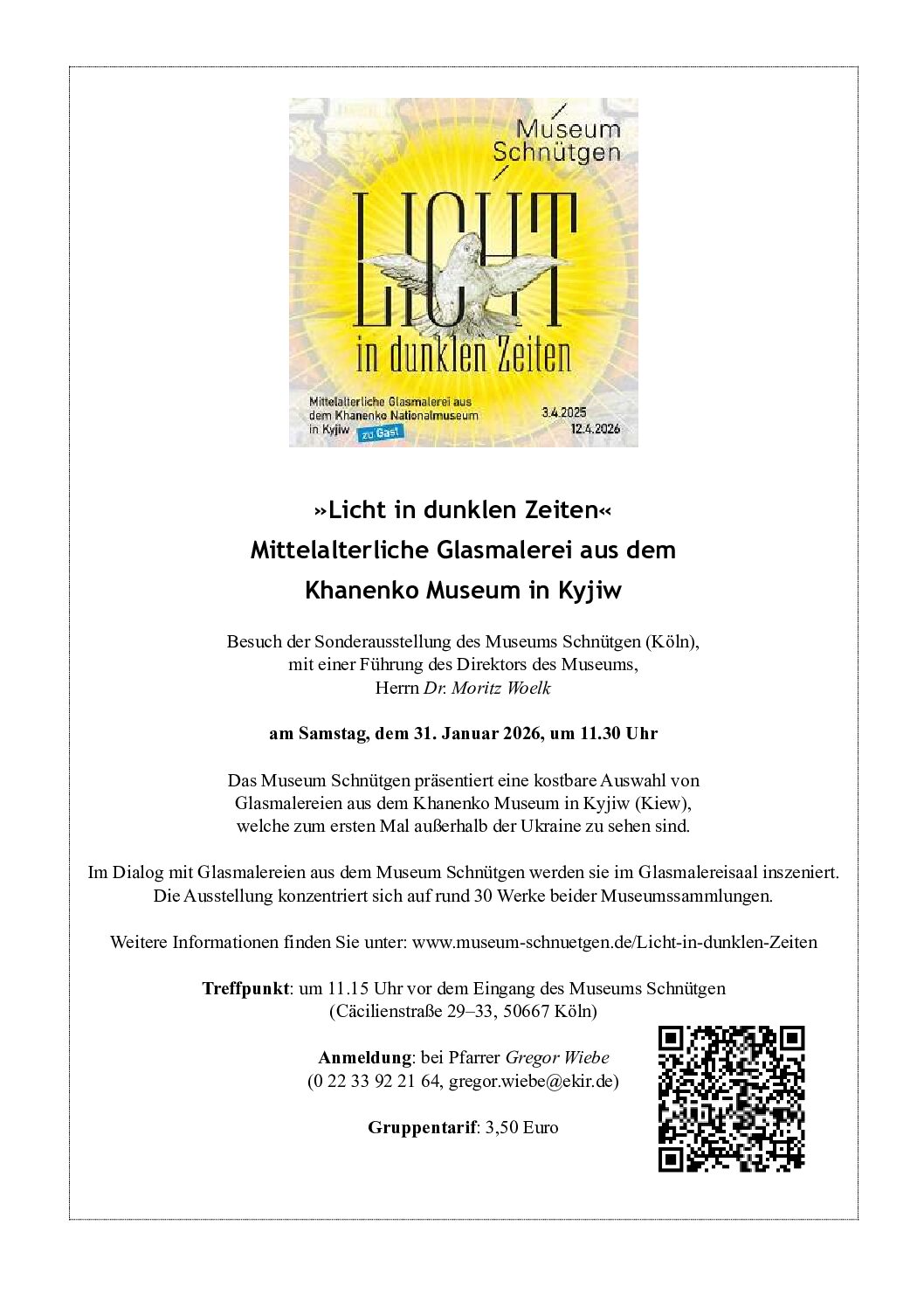 Unter dem Titel „Licht in dunklen Zeiten“ zeigt das Museum Schnütgen mittelalterliche Glasmalerei aus der eigenen Sammlung und aus dem Khanenko Museum in Kiew. Sie sind herzlich eingeladen zu einem gemeinsamen Besuch dieser Sonderausstellung und