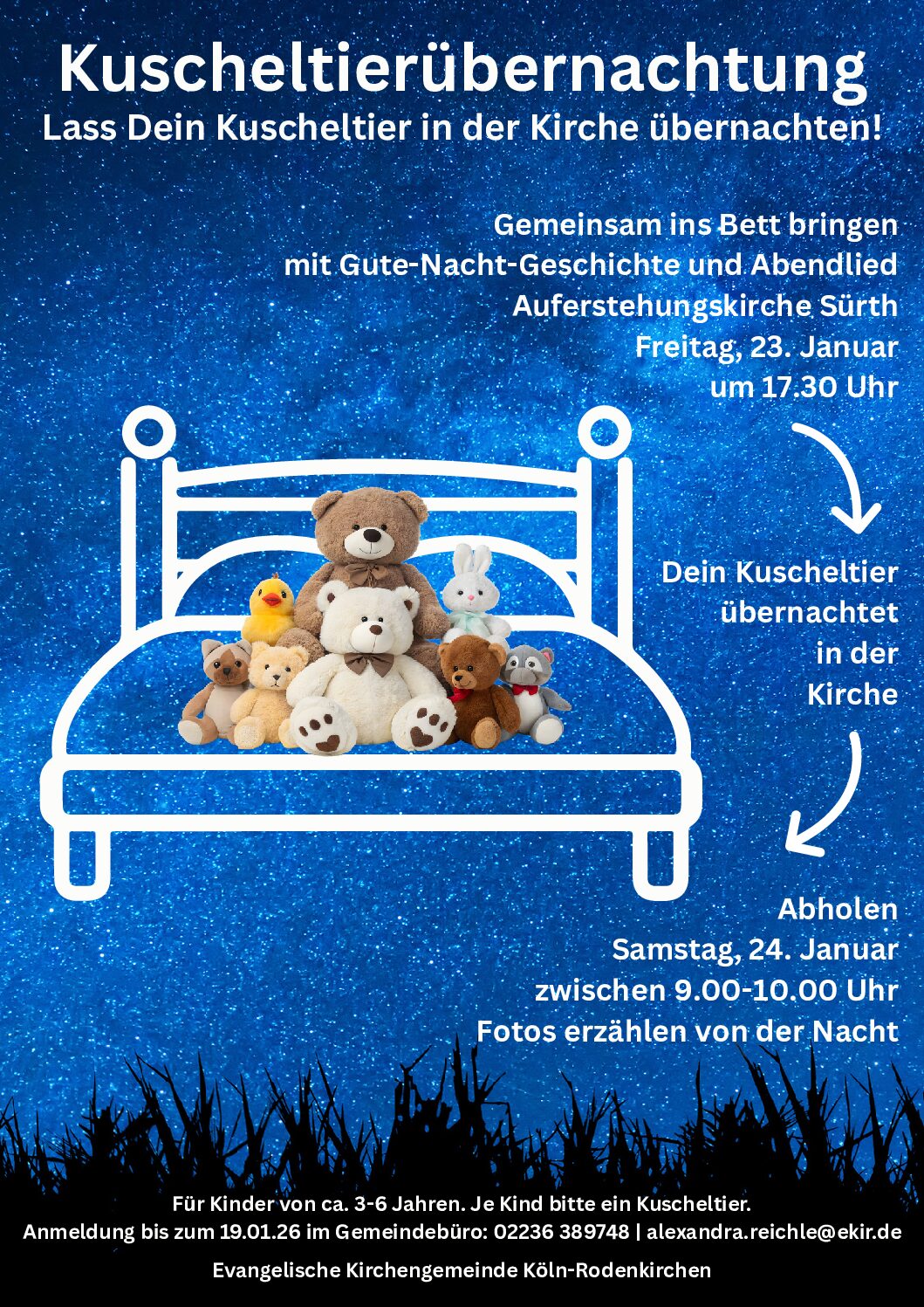 Eine Kirche ist ein ganz besonderer Ort – nicht nur für uns Menschen. Deswegen laden wir alle Kinder von ca. 3-6 Jahren ein: Lasst Euer Kuscheltier eine Nacht lang in der Auferstehungskirche übernachten! Wir treffen uns